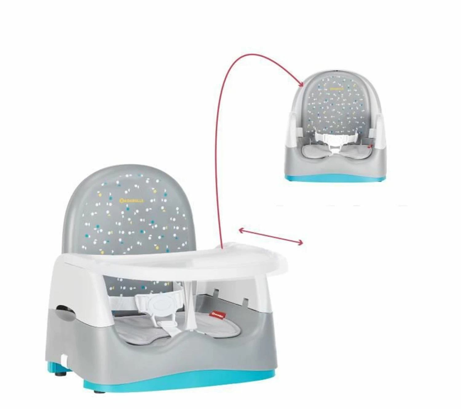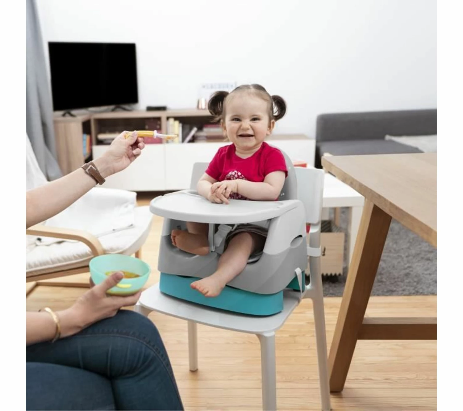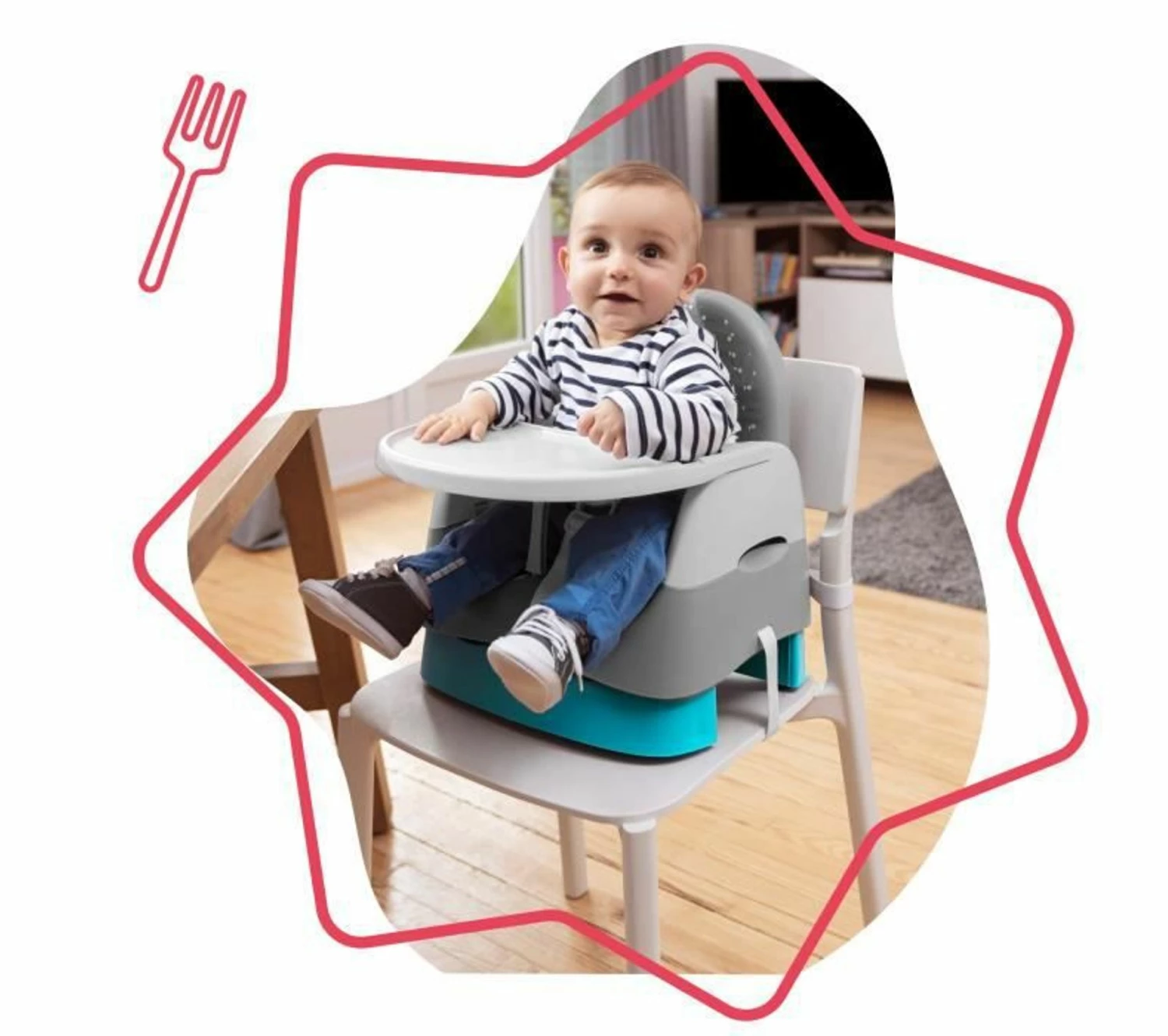 Réhausseur de chaise avec assise ergonomique et confortable grâce a son coussin -réglable en hauteur sur 3 positions (10 a 14cm) -simple a manipuler -fixation par sangles sur chaise adulte -tablette ajustable en profondeur, amovible avec rangement futé -pliage compact (-de 20 cm) -harnais 3 points -utilisation 6 a 24/36 mois (jusqu’a 15kg) -fabriqué en espagne