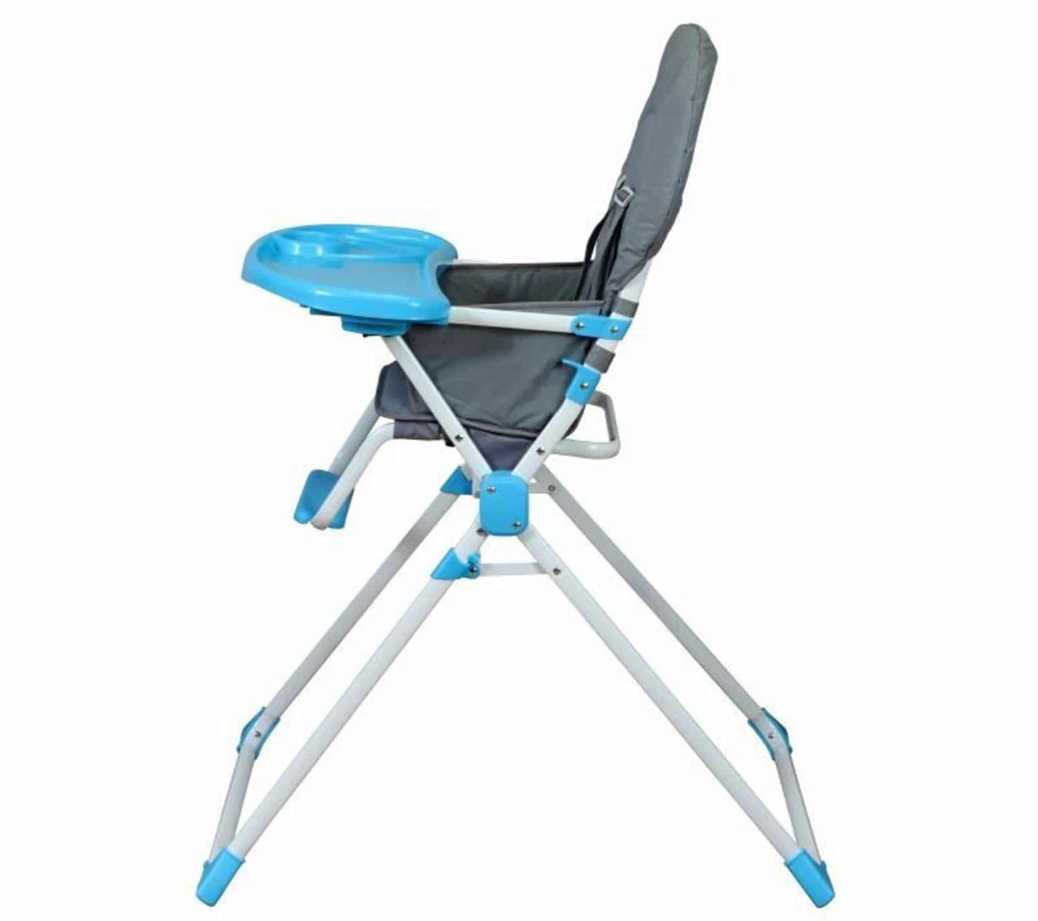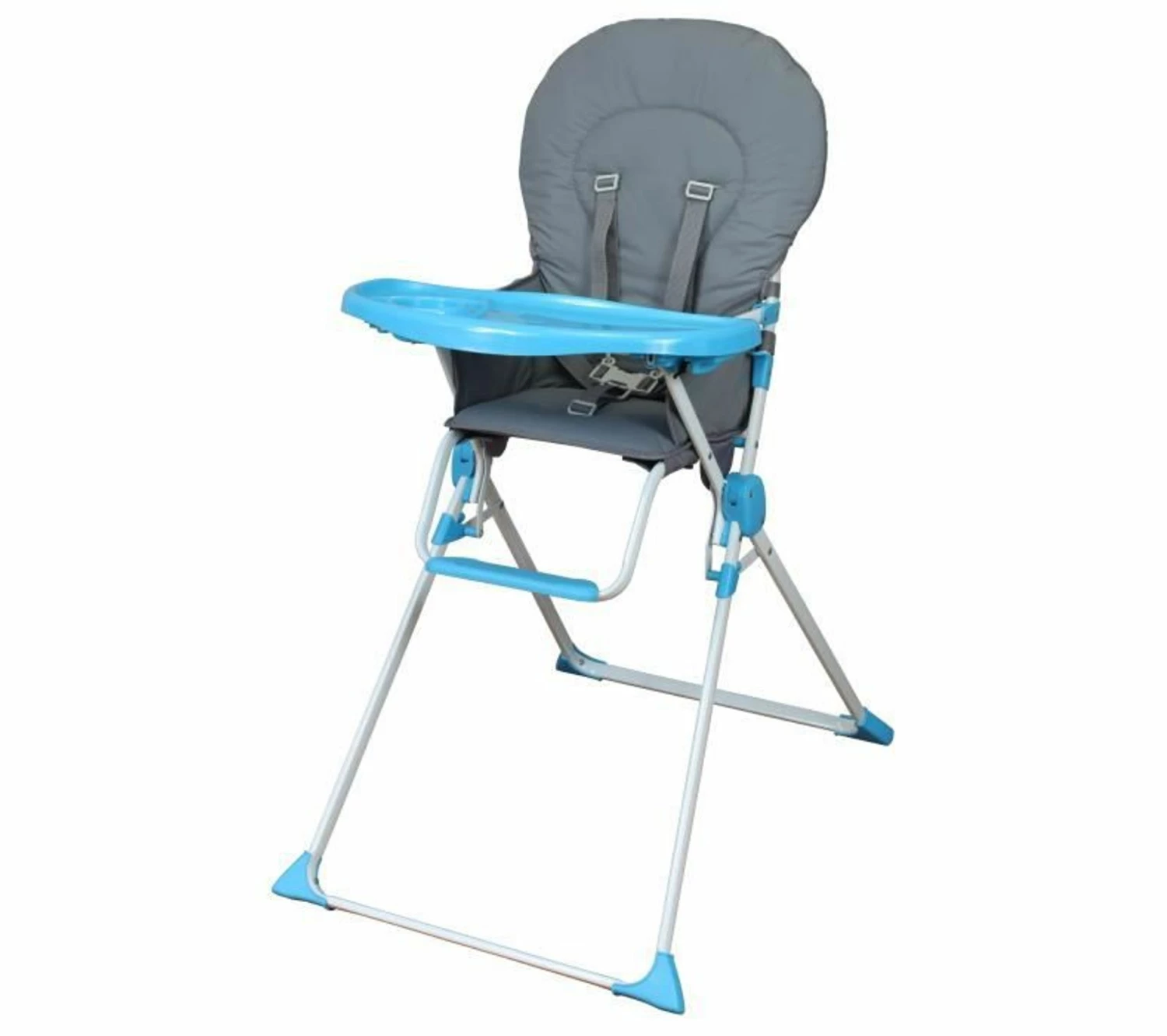 Chaise haute fixe – assise en pvc – tablette amovible et réglable – harnais 5 points – repose-pieds – pliage extra compact – coloris gris et turquoise – mixte – de 6 à 36 mois – livré à l’unité.
