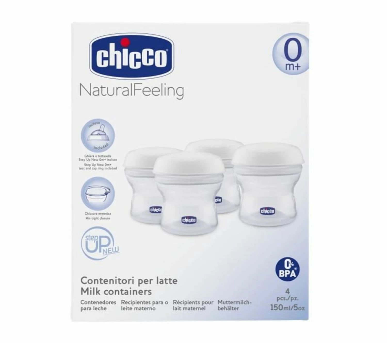 Lot de 3 récipients de conservation du lait maternel + 1 biberon natural feeling 150 ml avec tétine en silicone a flux normal. 4 couvercles hermétiques. Légers et facilement stérilisables. Empilables. Sans bisphénol a.