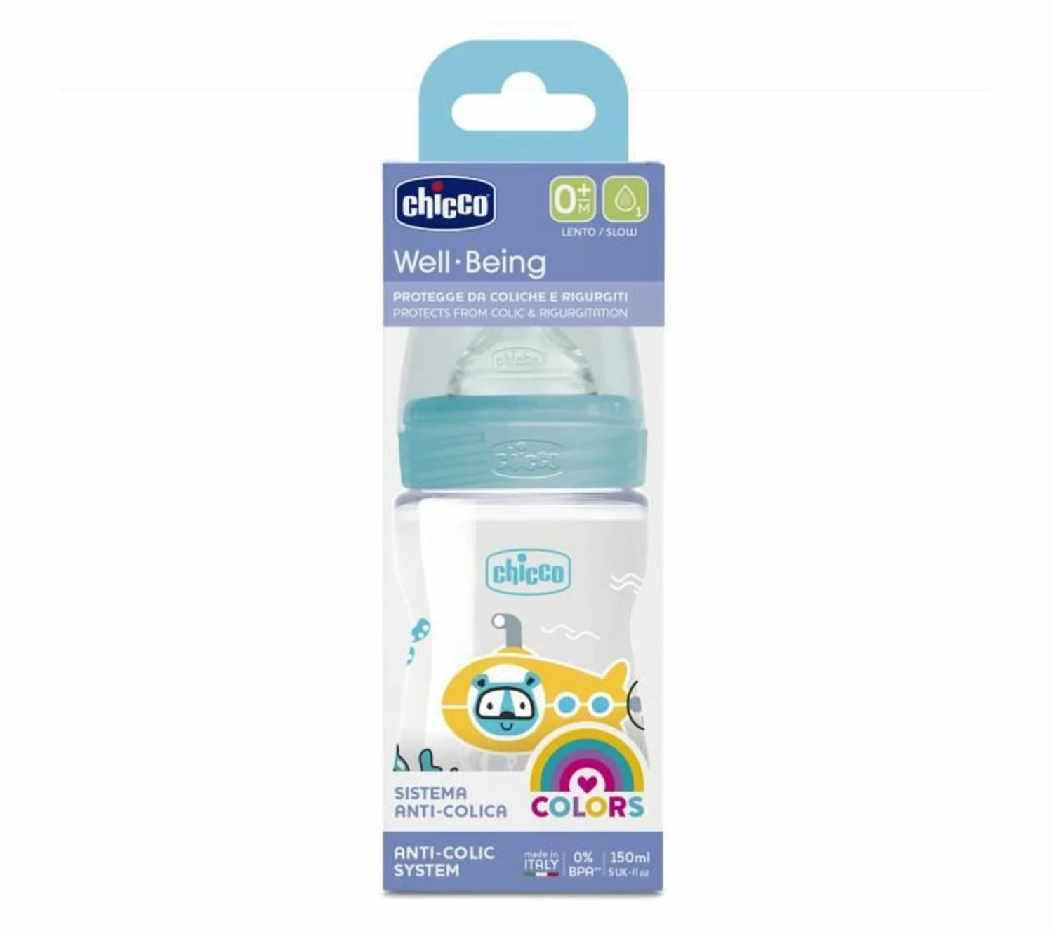 Biberon en pp (polypropylene) de 150 ml, joliment décoré et avec capuchon anti-fuite. Col large pour un nettoyage et un remplissage simplifiés. Bouteille ergonomique pour faciliter la prise en main du biberon. Tétine physiologique en silicone extra-doux avec valve anti-colique, flux lent.