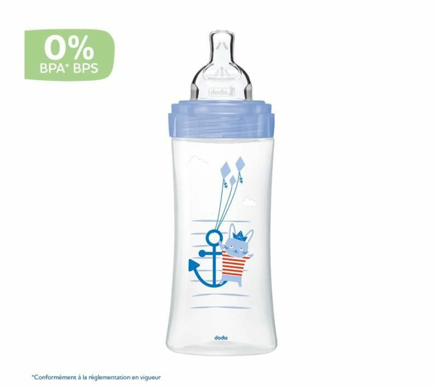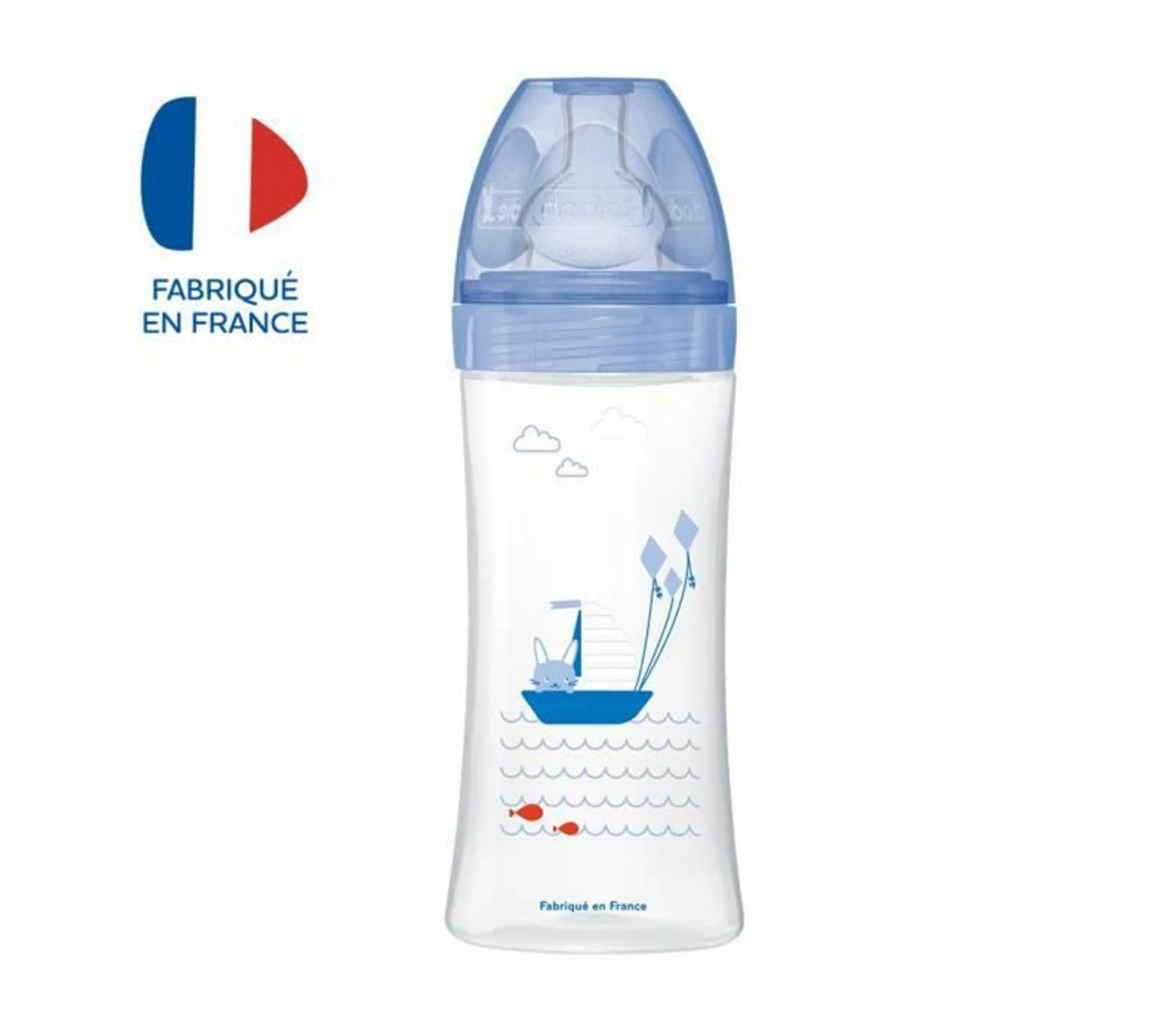 Biberon sensation+ 330ml, décors mer, équipé d’une tétine plate débit rapide. Son systeme anti-colique est intégré a la tétine grâce a une double valve brevetée, qui favorise la circulation de l’air et réduit les risques de coliques, d’aérophagie et de régurgitations. La tétine plate imite la forme aplatie du sein pendant la tétée, et elle est acceptée facilement par 95% des bébés