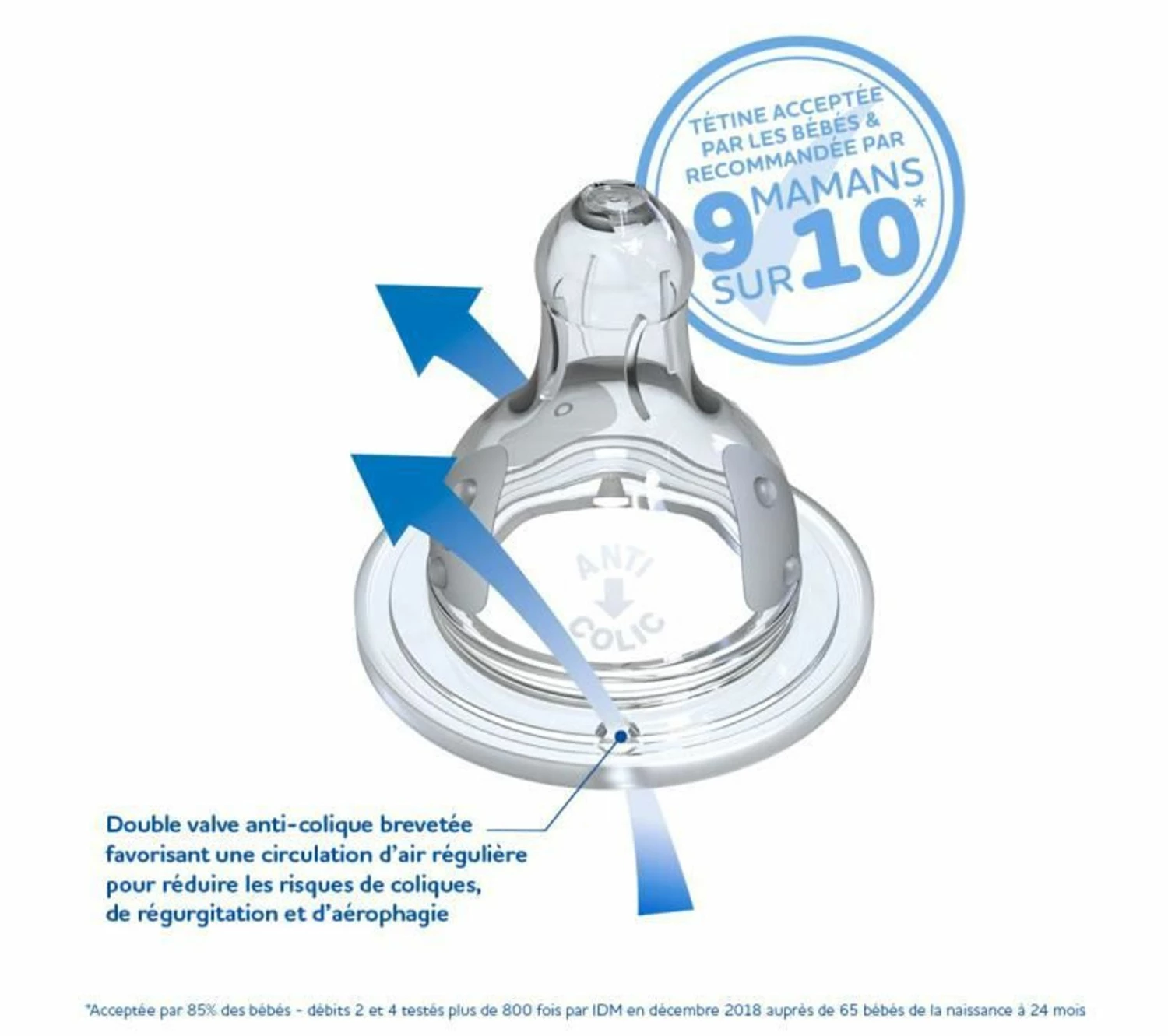 Son systeme anti-colique est intégré a la tétine grâce a une valve brevetée, qui favorise la circulation de l’air et réduit les risques de coliques, d’aérophagie et de régurgitations. La tétine ronde 3 vitesse permet d’adapter le débit au rythme de succion de bébé, en alignant le repere avec le nez de bébé au cours du repas