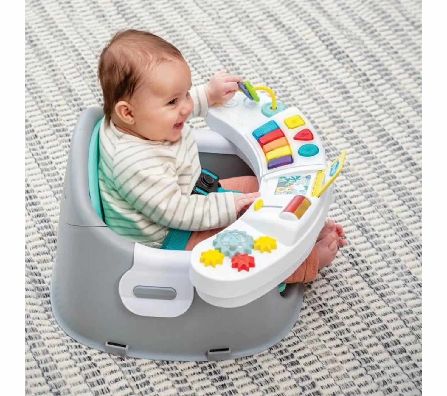Réhausseur 3 en 1 avec plateau de jeu électronique: siege d’activités, réhausseur avec plateau et réhausseur simple. La sécurité est maximale avec le harnais 3 points et la double fixation par sangles pour utilisation sur une chaise. Le réducteur d’assise en mousse est confortable pour bébé et peut se retirer lorsqu’il grandit.
