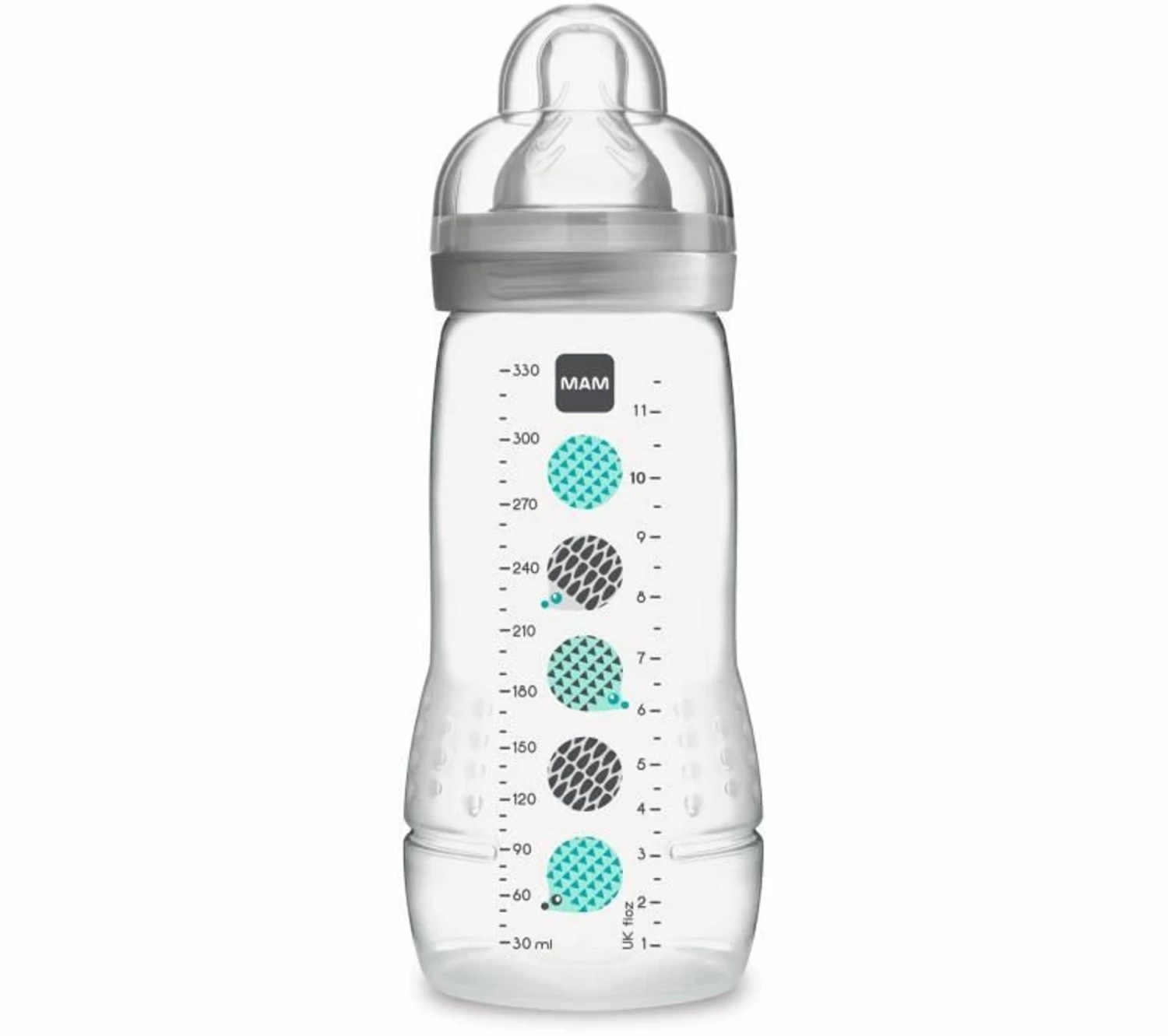Mam biberon easy active 2eme âge – tétine ultra-douce brevetée, reconnue instinctivement par bébé – col large pour un remplissage et un nettoyage facile – graduation adaptée aux mesures de lait – sans bisphénol a – a partir de 6 mois – tétine débit x
