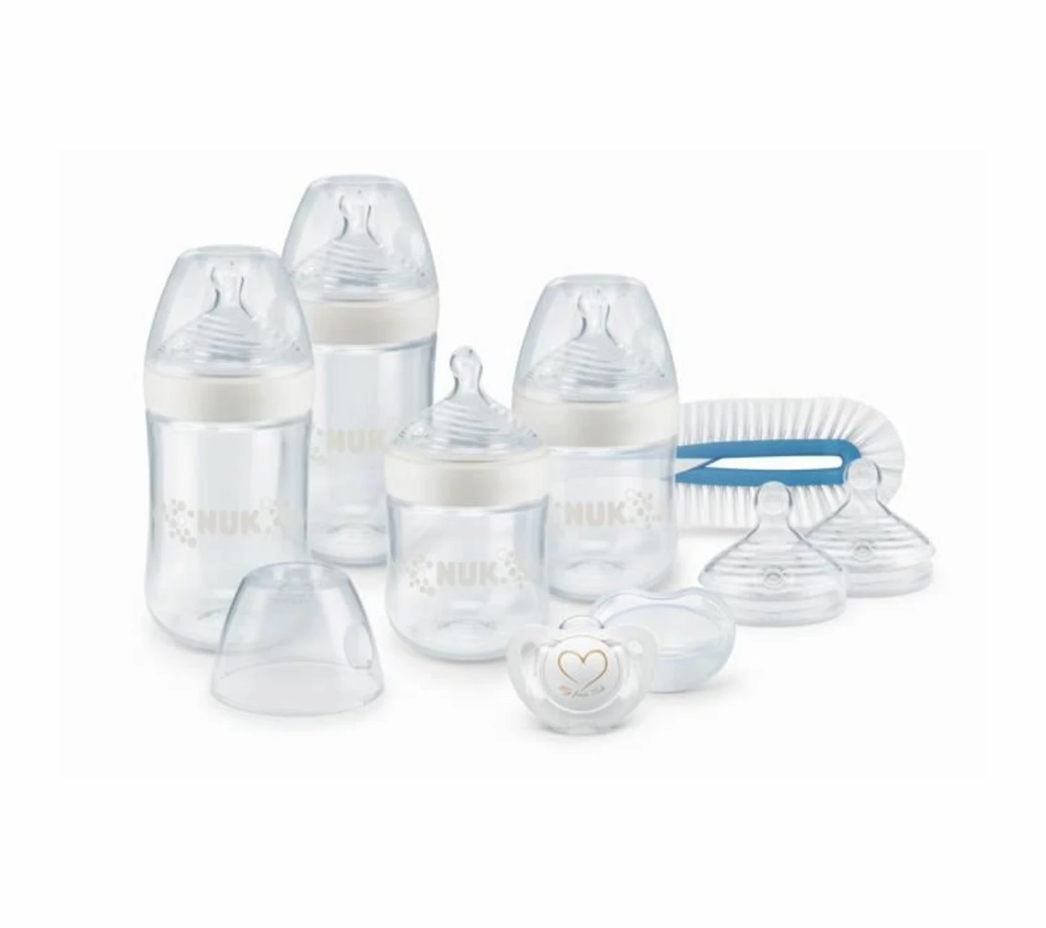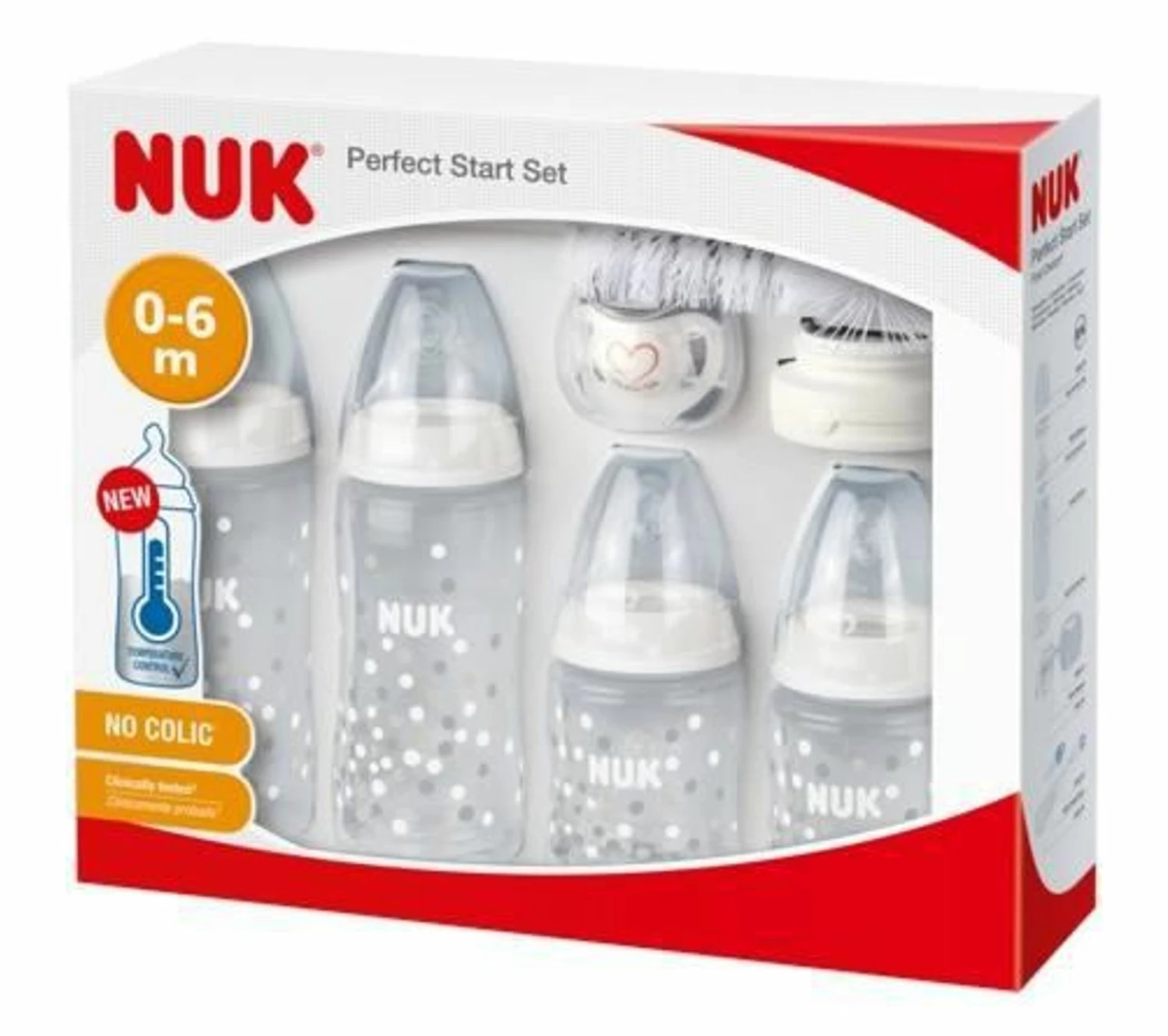 Coffret nuk 4 biberons perfect start nature sense temperature control. Soyez plus sûr avec temperature control ! Pour éviter de donner un biberon trop chaud a votre bébé, les biberons nuk sont maintenant dotés du nuk temperature control, un nouvel indicateur réactif a la chaleur. Situé au niveau de la graduation, il ressemble a un thermometre et change de couleur en fonction de la température du contenu du biberon. Si le contenu est trop chaud, l’indicateur bleu passe au blanc. Il est recommandé de nourrir bébé a une température proche de celle du corps (37°c = ton bleu). le développement de la tétine nuk nature sense repose avant tout sur le constat médical que le sein maternel est constitué de micro-canaux lactiferes. Ces micro-perçages assurent un débit de tétée régulier et naturel. Le coffret comprend : 2 biberons 150 ml (0-6 mois), 2 biberons 260 ml (6-18 mois), 6 tétines silicone, 1 goupillon, 1 sucette et son étui. Détail du coffret : – 2 biberons 150 ml en polypropylene, tétine 0-6 mois, lait maternel/eau. – 2 biberons 260 ml en polypropylene, tétine 6-18 mois, lait infantile. – 2 tétines supplémentaires en silicone, 0-6 mois, lait maternel/eau. – 1 sucette genius. – 1 goupillon. – décor blanc. Caractéristiques des tétines : – micro-perçages, reproduisant les canaux lactiferes du sein et assurant ainsi un débit de tétée régulier et naturel. – base élargie et souple de la tétine, pour une sensation de succion naturelle des que bébé y pose ses levres. – zone extra douce, rendant l’embout aussi souple que le sein maternel. – valve anti-colique innovante, pour une tétée ininterrompue comme au sein, empechant d’avaler de l’air, ce qui réduit le risque de coliques. – selon une étude réalisée : 92% des bébés acceptent la tétine, 98% des mamans estiment que les micro-perçages créent une expérience de tétée plus naturelle, 99% des mamans recommanderaient l’usage de la tétine naturel sense. Caractéristiques des biberons : – capuchon anti-fuite qui permet une fermeture étanche lors du mélange du lait. – bague de serrage qui épouse parfaitement la tétine. – forme cintrée facilitant la prise en main. – ouverture extra-large pour un remplissage et nettoyage faciles. Contient également une sucette genius physiologique silicone 0-6 mois : – extra douce sur le dessus pour un confort optimal au niveau du palais. – extra lisse pour laisser plus de place pour la langue et plus de liberté de mouvement. – base extra fine et étroite pour minimiser la pression sur la mâchoire et sur les dents. Norme en 14350, sans bpa (selon la réglementation en vigueur), fabriqué en allemagne, recommandé par les sages-femmes et les pédiatres.